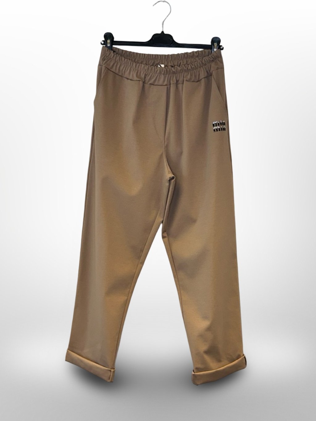 POHODLNÉ KALHOTY DO GUMY S NAZNAČENÝM POKLOPCEM, ELEGANTNÍM ELASTICKÝM MATERIÁLEM, KAPSY NA PŘENÍ STRANĚ, DECENTNÍ KAMÍNKOVÁ APLIKACE