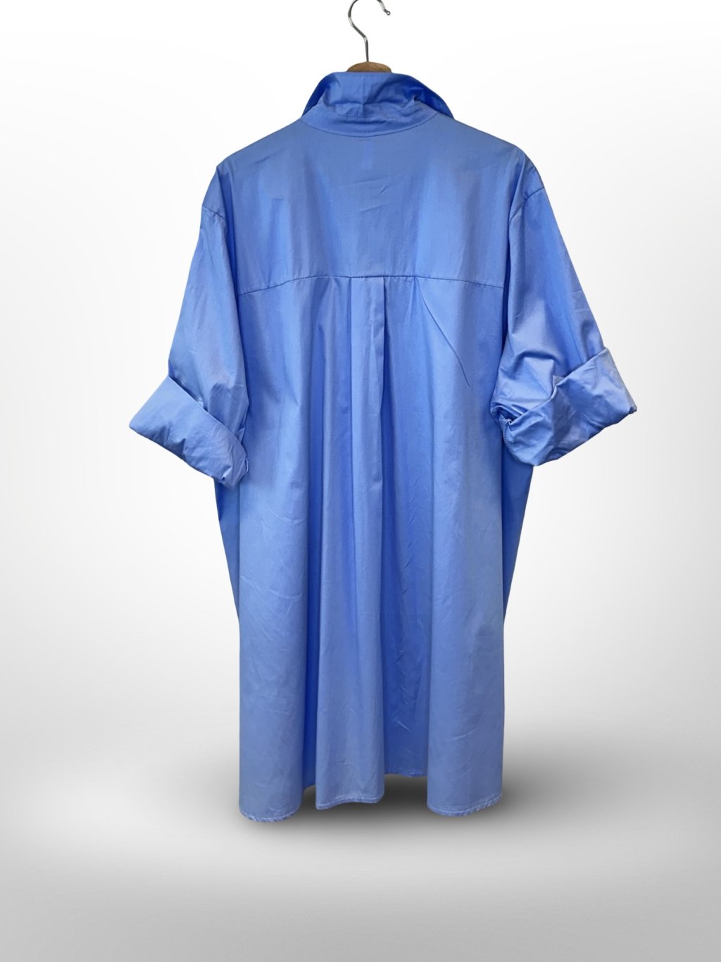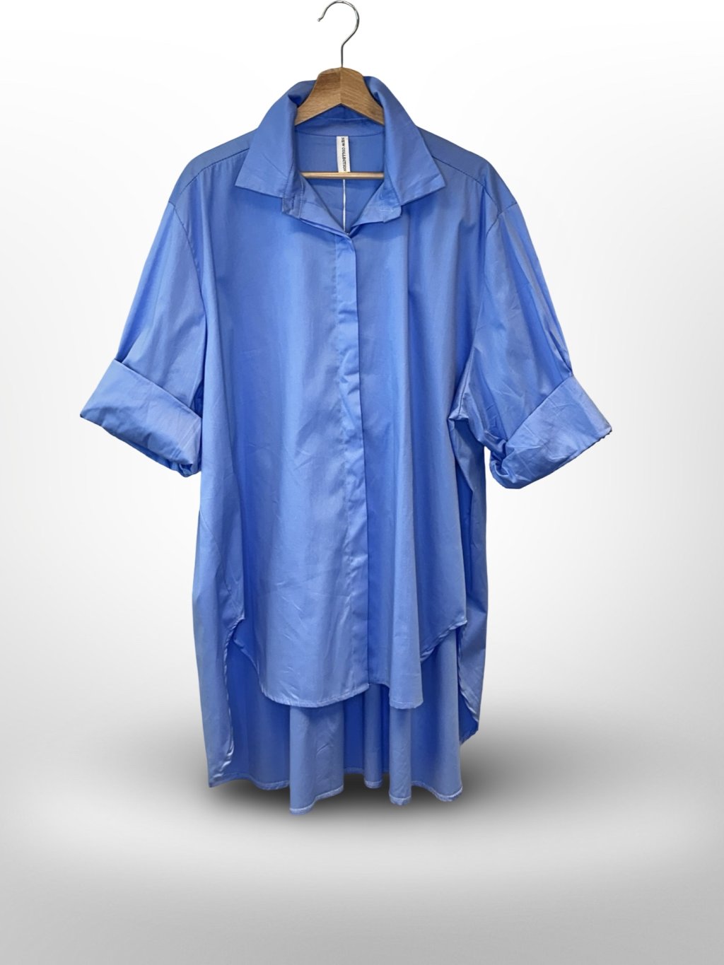 KOŠILE ASYMETRICKÉHO STŘIHU, PŘEDNÍ DÍL KRATŠÍ, ROZPARKY DO OBLOUČKU, RUKÁVY ZAKONČENÉ MANŽETOU, SKRYTÉ ZAPÍNÁNÍ NA KNOFLÍKY, LÁTKA NEPRUŽÍ.