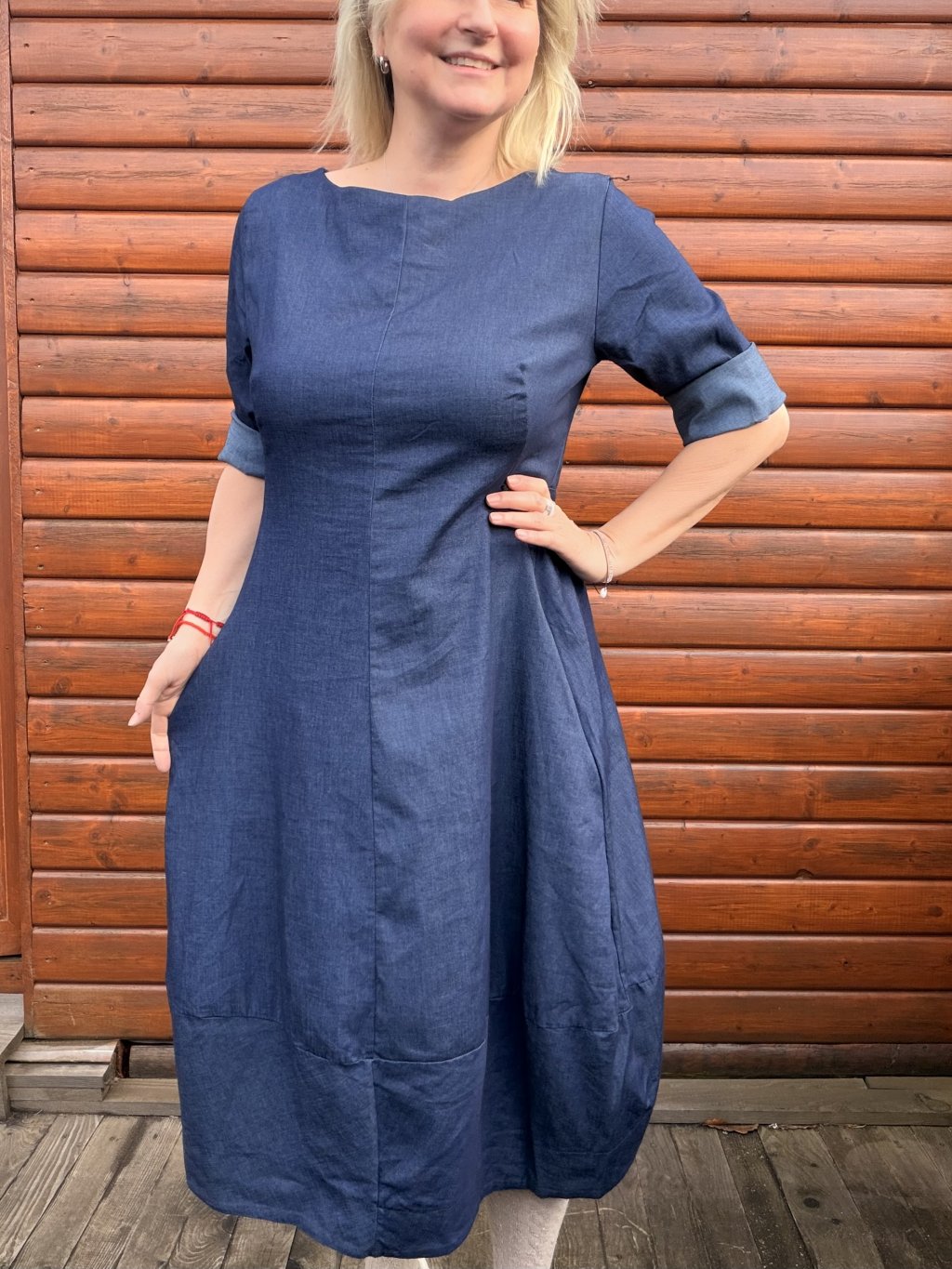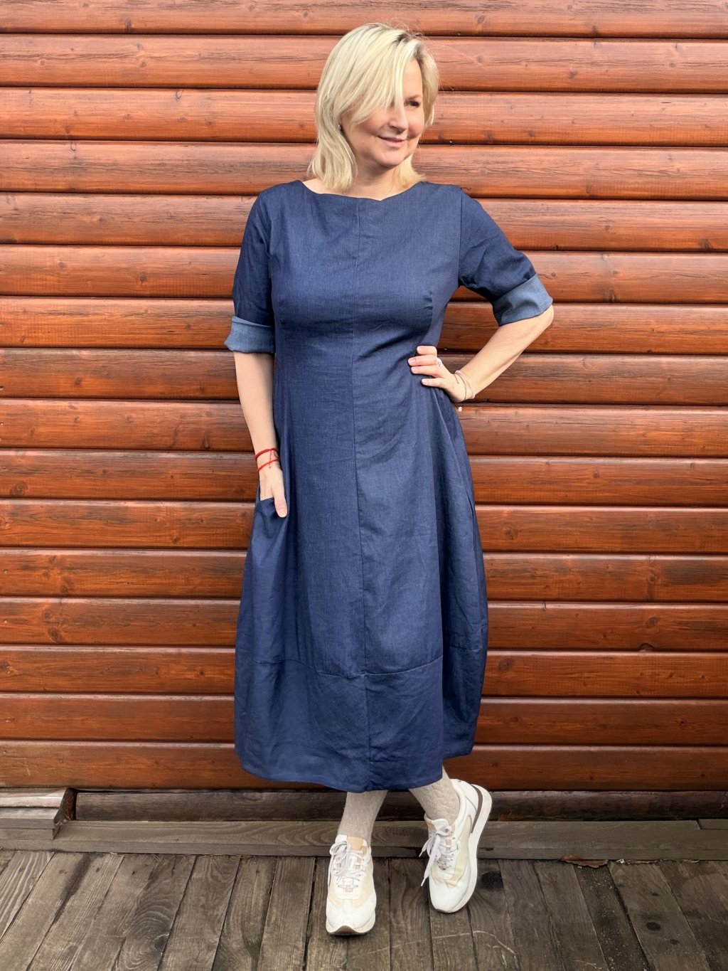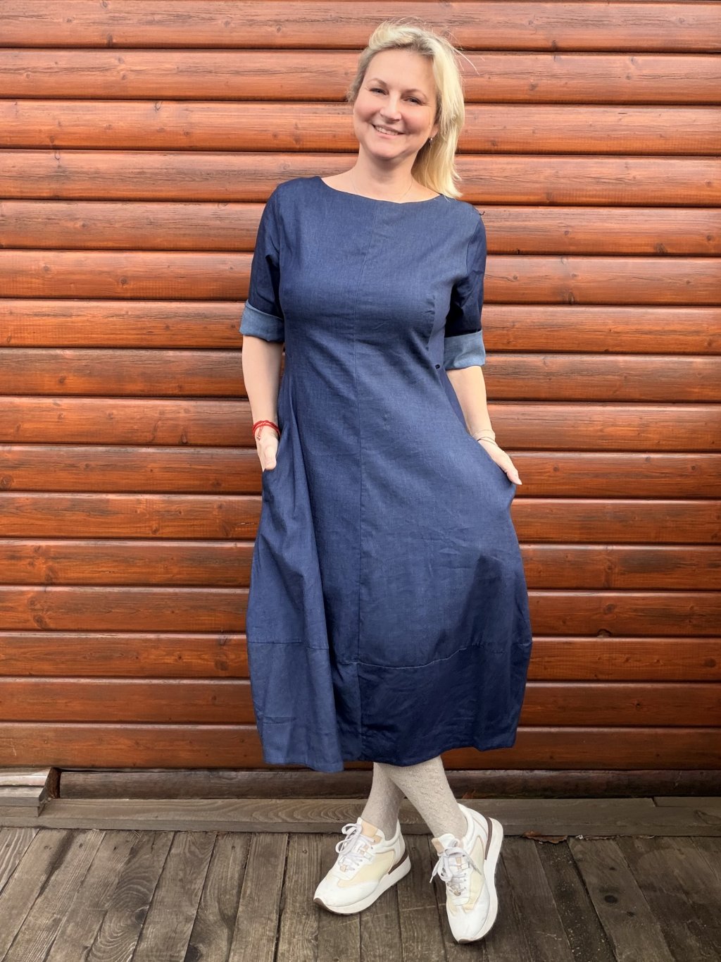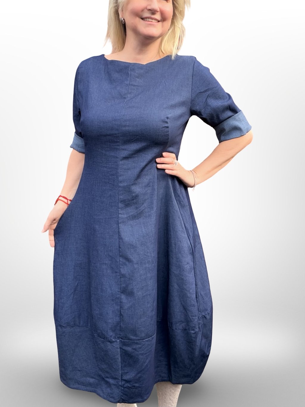 ŠATY JEANS VZHLEDU Z VELMI MÍRNĚ ELASTICKÉHO MATERIÁLU, SOUDKOVÝ STŘIH SUKNĚ A VYPASOVANÝ VRŠEK. ŠATY SE ZAPÍNAJÍ NA ZÁDECH NA ZIP, V BOČNÍCH ŠVECH JSOU UKRYTÉ POHODLNÉ KAPSY