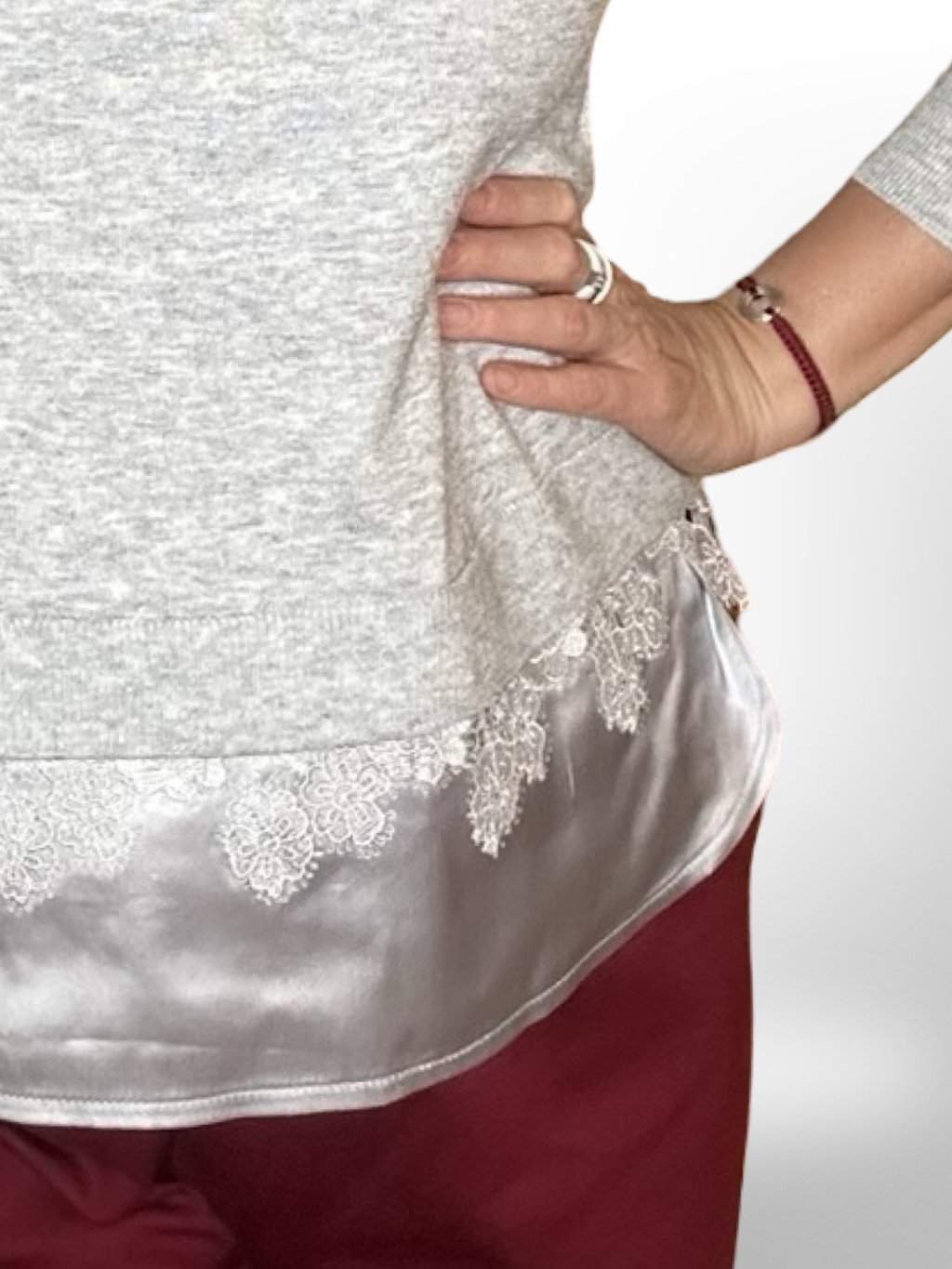 POHODLNÝ SVETR, KTERÝ PŮSOBÍ ELEGANTNĚ A ŽENSKY. SPODNÍ ČÁST JE DOPLNĚNA O KONTRASTNÍ VSADKU S JEMNÝM LESKEM A KRAJKOU, KTERÉ DODÁVAJÍ MODELU JEDINEČNÝ DETAIL.