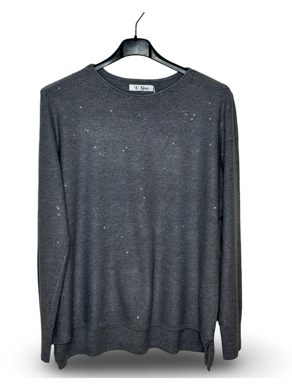 ELEGANTNÍ SVETR, KTERÝ OKOUZLÍ DECENTNÍMI FLITRY PO CELÉM POVRCHU. DÍKY TOMU PŮSOBÍ ŽENSKY, JEMNĚ A ZÁROVEŇ SLAVNOSTNĚ.