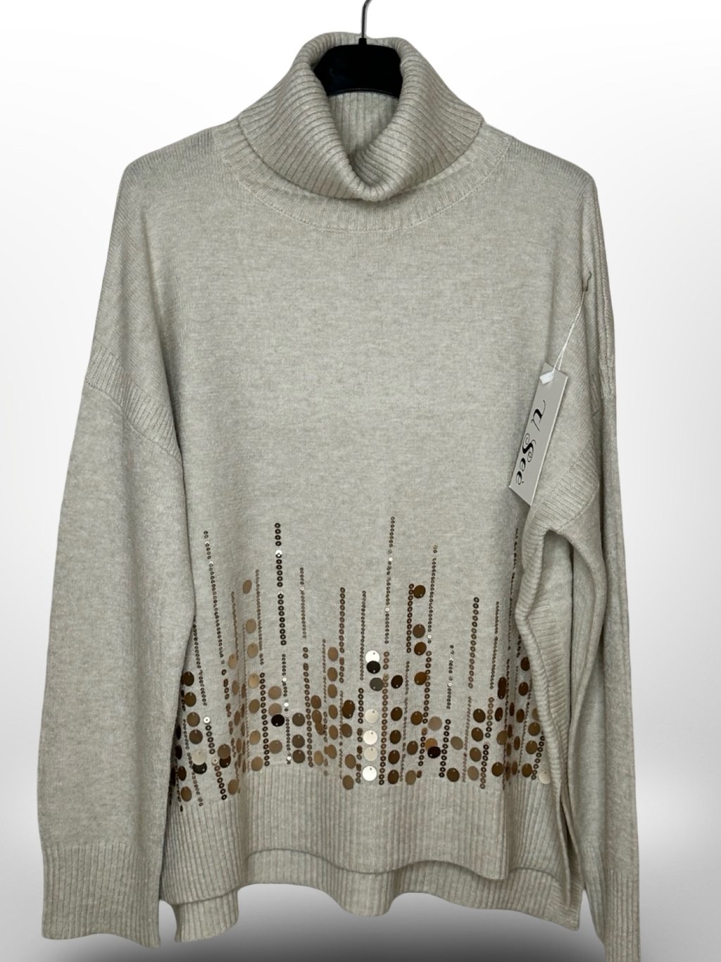 STYLOVÝ A HŘEJIVÝ SVETR, KTERÝ ZAUJME MODERNÍM ELEGANTNÍM FLITOVÁNÍM V DOLNÍ ČÁSTI.