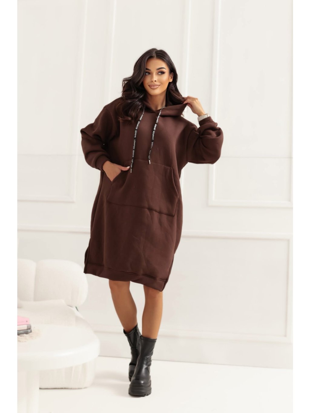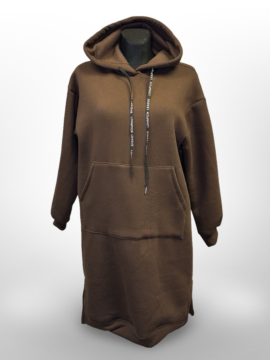 HODNĚ TEPLÉ ŠATY Z POČESANÉ TEPLÁKOVINY S KLOKANKOU A KAPUCÍ.