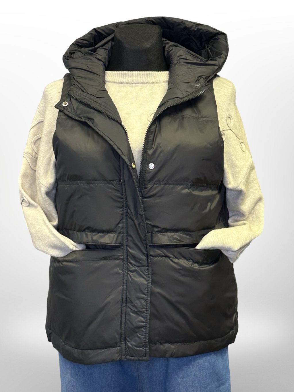 PŘÍJEMNÁ VESTA S KACHNÍM PEŘÍM S KAPUCÍ, KAPSY NA PŘEDNÍ STRANĚ, ZAPÍNANÍ NA ZIP A DRUKY, SPODNÍ LEM NA STAŽENÍ