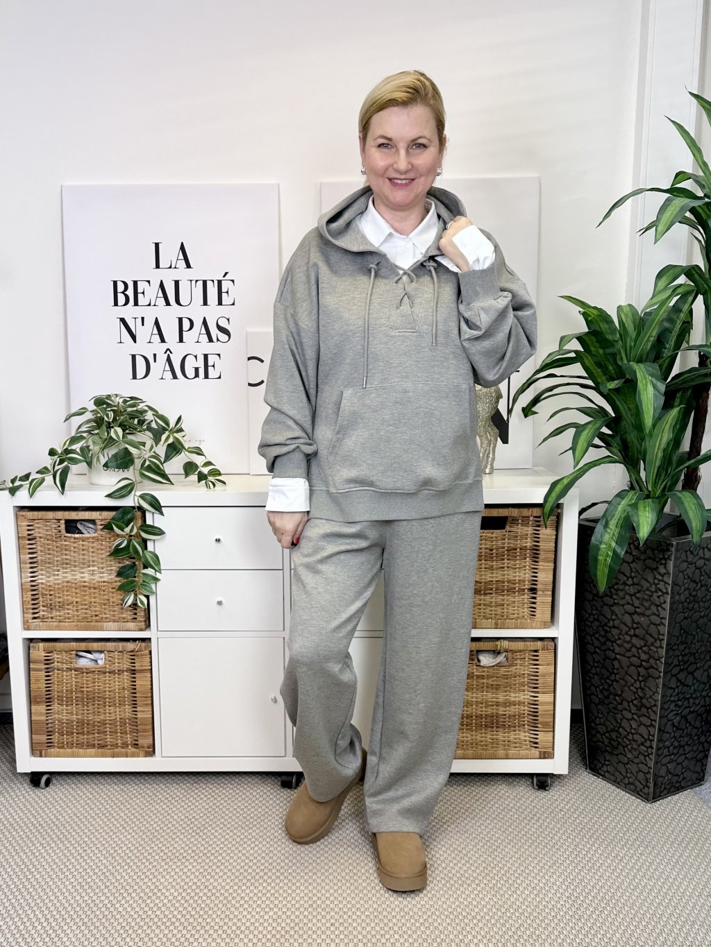 MIKINA s kapucí a klokankou má ozdobné šněrování výstřihu a rozparky po boku. Rukávy mají hlubší ramenní hlavici, což je příjemné pro obsažení velikostí od 38-42.