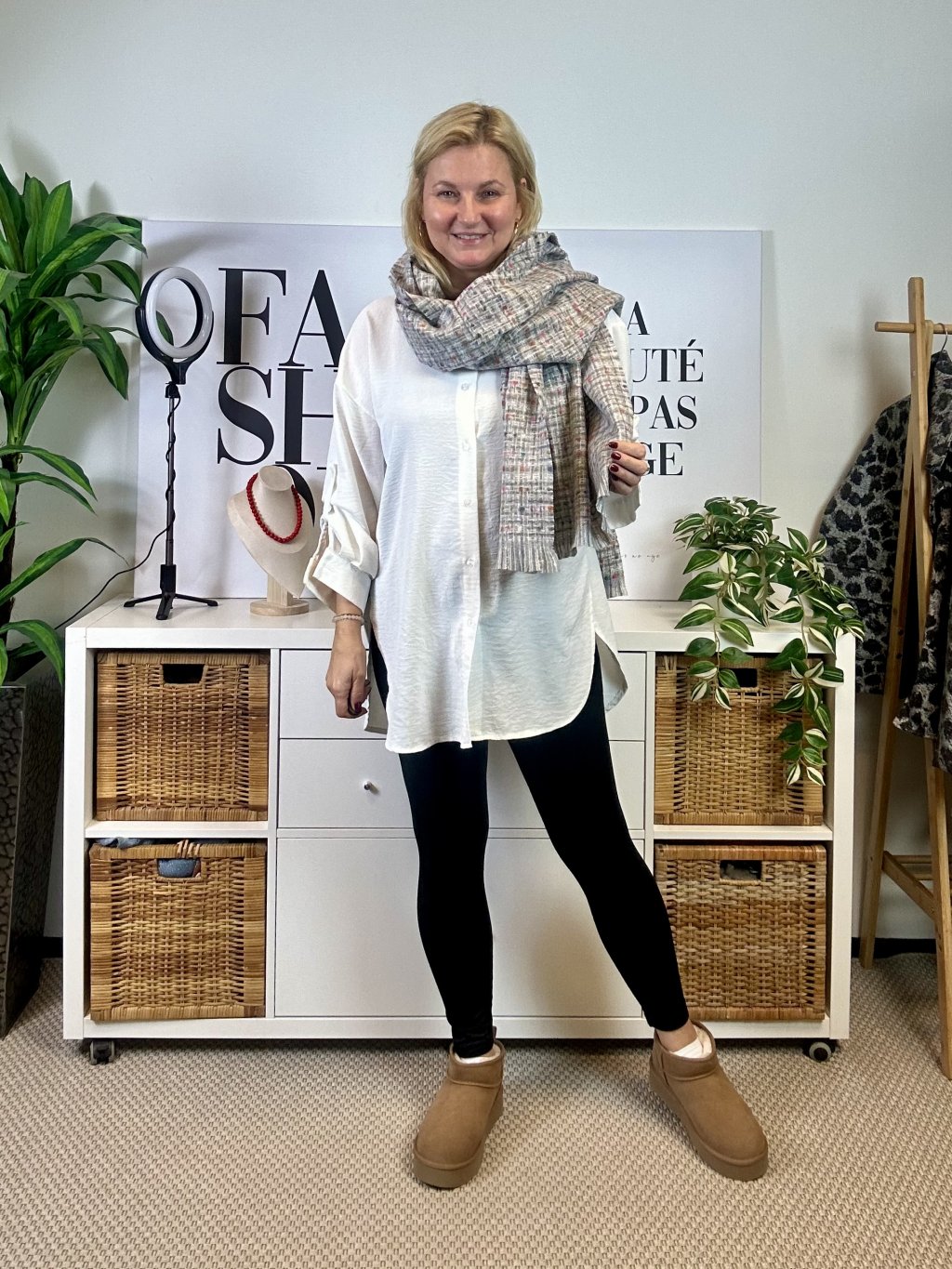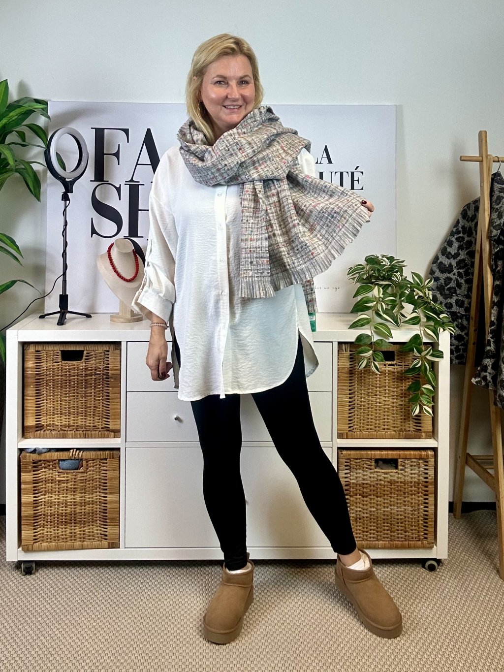 Zimní šála s jemnou lurexovou nitkou a barevnými nopkami